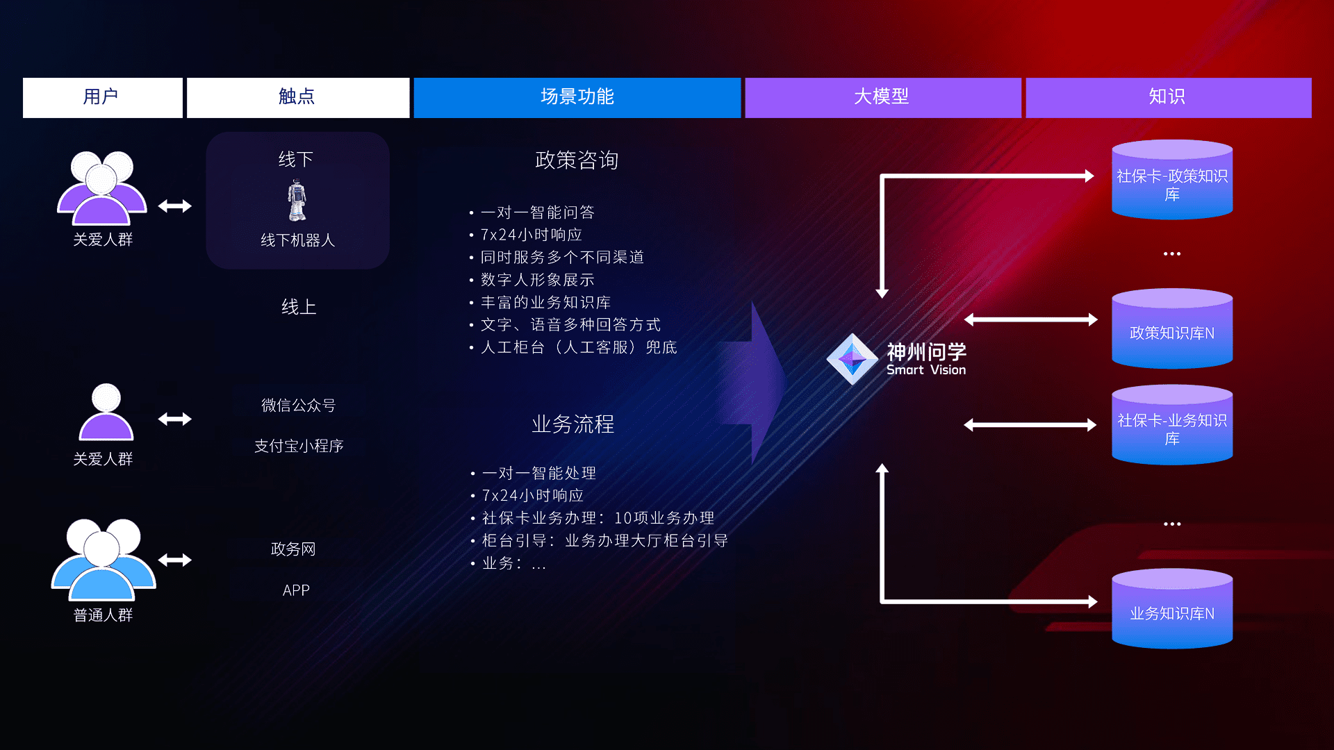 • 线上线下全覆盖:线上提供微信公众号、、、、支付宝小程序、、、、政务网、、、、app多种渠道,,,与线下机器人形成完整服务体系。。。