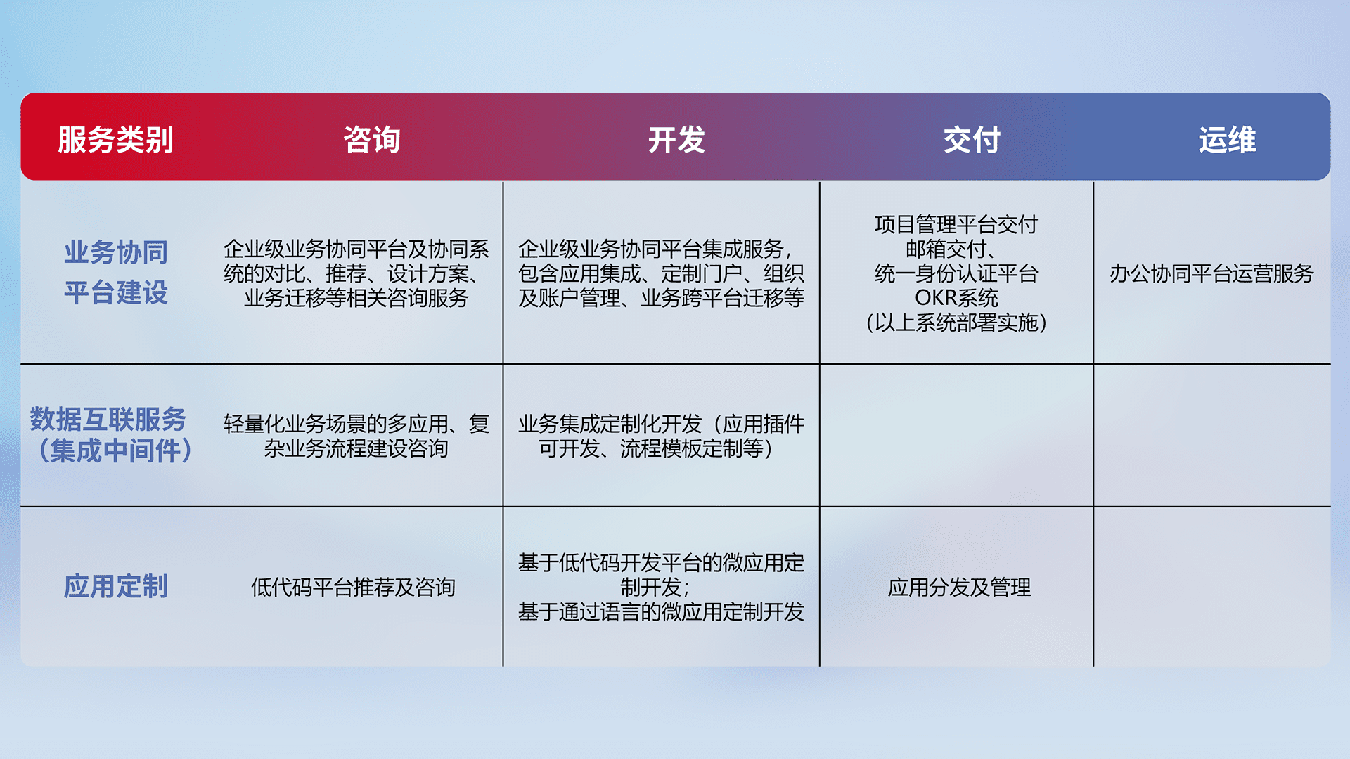 针对钉钉、、企微、、、IDaas等平台级产品提供产品的规划、、、、方案、、、交付、、定制化开发等服务,,实现如统一协同办公、、、智能客户服务、、、混合会议管理、、、、智能数据查询、、、等业务场景,,,实现数字化转型。。